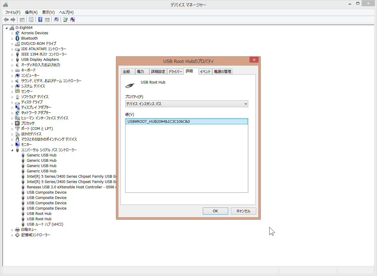 ; 私の環境ではUSB Root Hubが複数あるので、表示されるインスタンスパスを覚えます