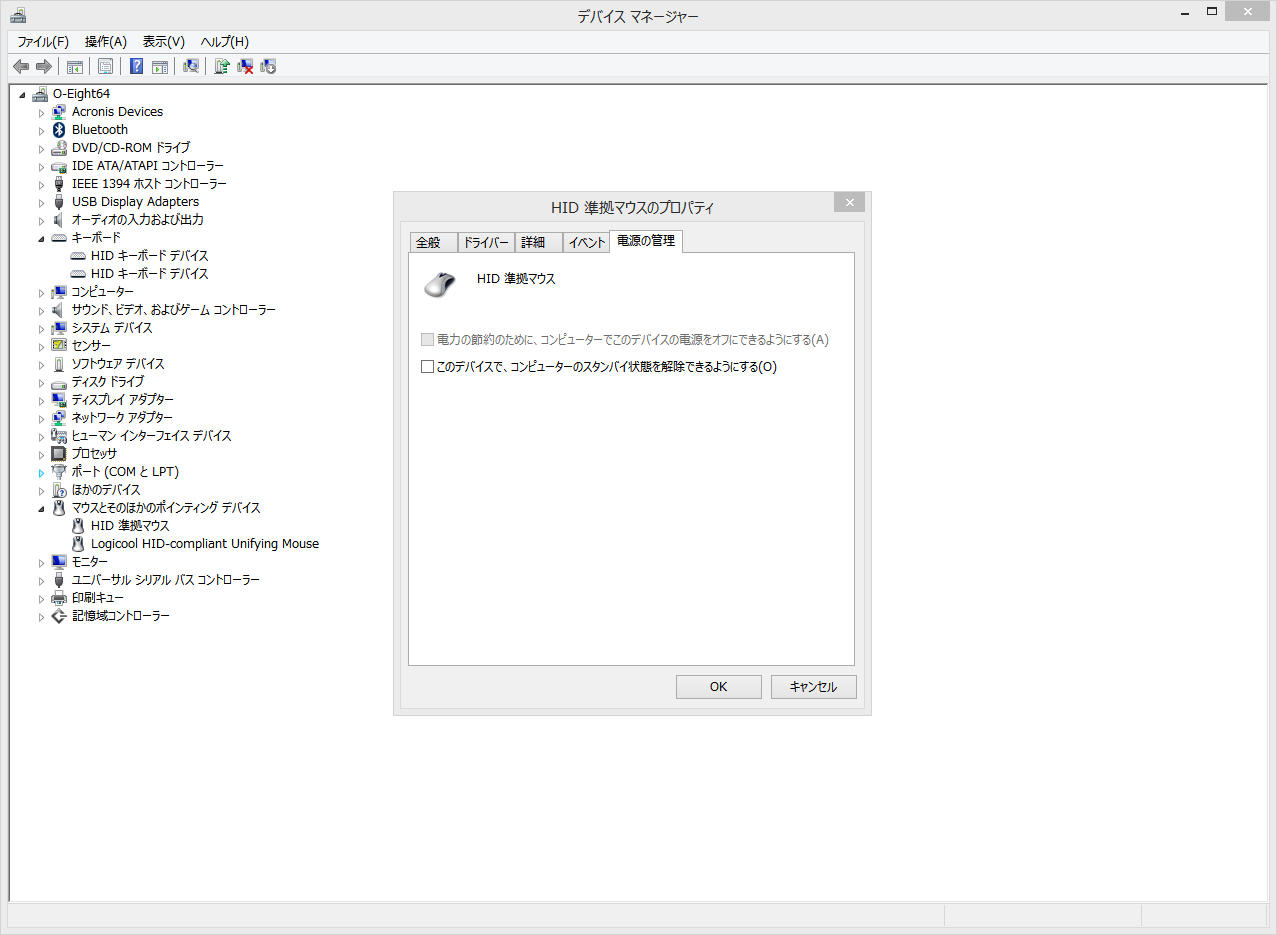 [キーボード]、[マウスとそのほかのポインティング デバイス]以下すべてのドライバのプロパティを開き、[電源の管理]から、[このデバイスで、コンピュータのスタンバイ状態を解除できるようにする]をオフにします。